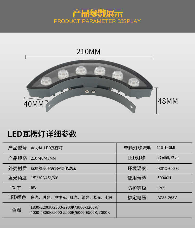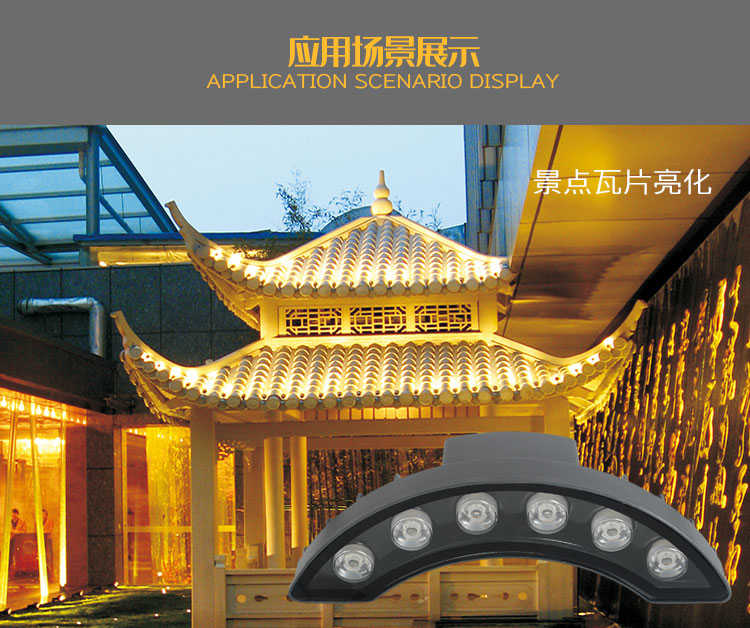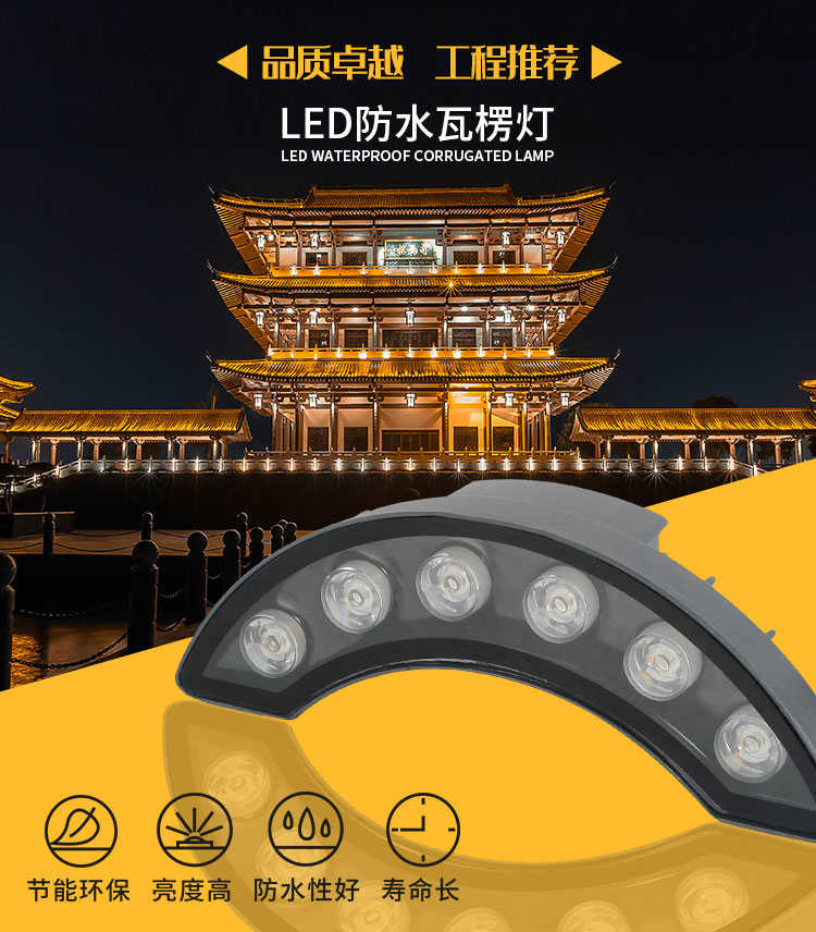 瓦楞灯专区 主页 > 产品中心 > 瓦楞灯专区 > LED瓦楞灯户外防水月亮灯凉亭瓦面投射灯 产品名称:LED瓦楞灯 产品品牌:奥光达AogdA 产品型号:AogdA-JGLHWLD01 产品功率:3W;5W;6W; 产品颜色:正白;暖白;RGB七彩; 产品控制:外控; 产品材质:压铸铝+钢化玻璃; 额定电压:AC220V;DC24V; 适用范围:广场、公园、街头、广告,古建筑、观光亭等照明。