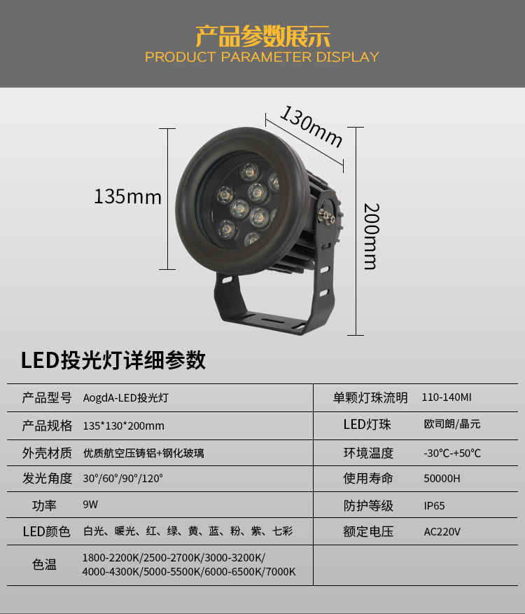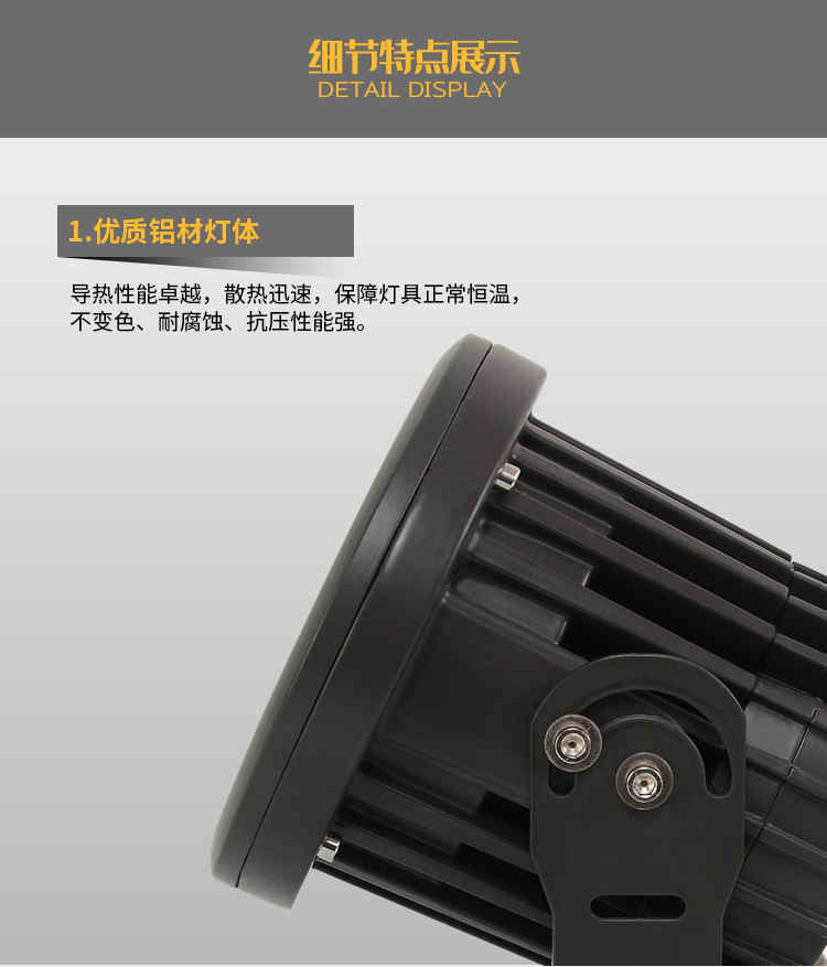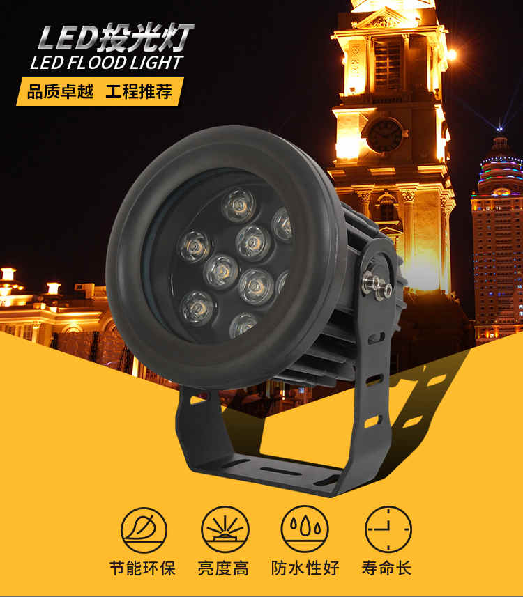 投光灯专区 主页 > 产品中心 > 投光灯专区 > led照射灯户外防水投射灯工程庭院照树灯聚光投光灯 产品品名:新款LED投光灯;聚光投光灯 产品品牌:忠信照明 输入电压:AC85-265V 产品重量:5.85KG 产品功率:24W;36W; 灯珠芯片:欧司朗/晶元大功率芯片 产品显指:大于80 防水等级:IP65 发光角度:45-60度 产品材质:优质航空压铸铝材+钢化玻璃 质保期限:两年 发光色温:正白;暖白;红光;黄光;蓝光;蓝光 适用场地:户外大楼墙体亮化;桥梁照明工程;古建筑物照明;公园树木亮化 广告招牌;广场射灯等照明