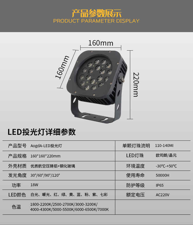 投光灯专区 主页 > 产品中心 > 投光灯专区 > 聚光led投光灯聚光罗马柱投光灯一束光 投光灯 产品品名:新款LED投光灯;聚光投光灯 产品品牌:奥光达AogdA 输入电压:AC85-265V 产品重量:5.85KG 产品功率:24W;36W; 灯珠芯片:欧司朗/晶元大功率芯片 产品显指:大于80 防水等级:IP65 发光角度:45-60度 产品材质:优质航空压铸铝材+钢化玻璃 质保期限:两年 发光色温:正白;暖白;红光;黄光;蓝光;蓝光 适用场地:户外大楼墙体亮化;桥梁照明工程;古建筑物照明;公园树木亮化 广告招牌;广场射灯等照明