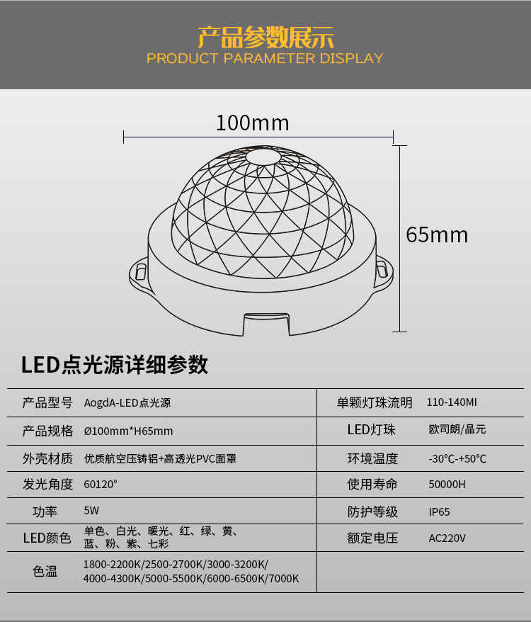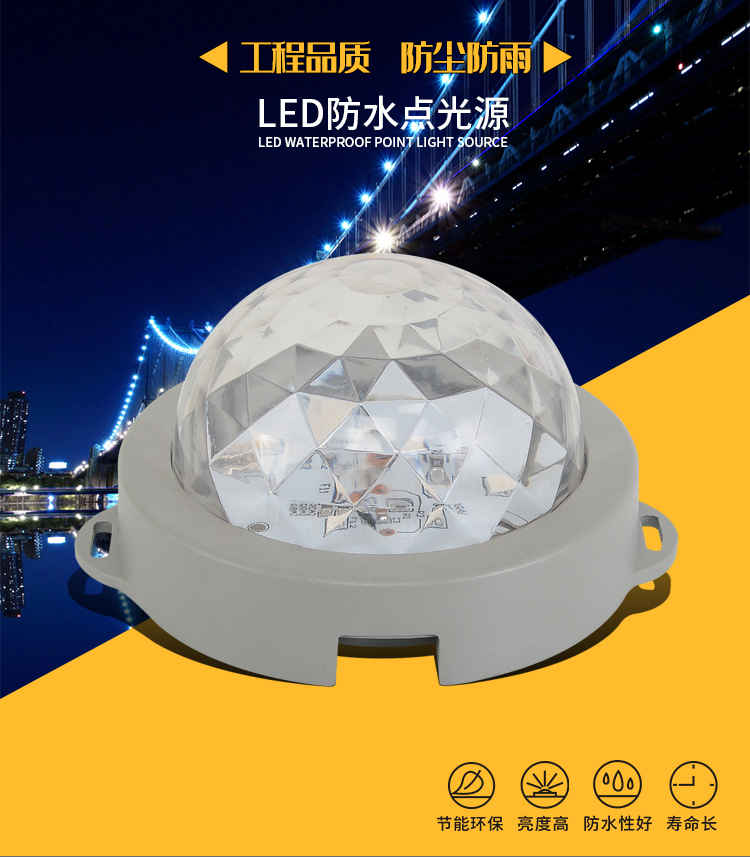点光源专区 主页 > 产品中心 > 点光源专区 > LED点光源七彩全彩闪光灯户外防水点光源 产品名称:LED点光源 产品品牌:忠信照明 产品型号:ZXZM-JGLH-XTD03 产品规格:1W:2W;3W;5W;7W 产品颜色:正白;暖白;红光;黄光;蓝光;绿光;紫光;RGB七彩; 额定电压:AC220V;DC24V; 适用范围:户外;桥梁;广告;工厂;墙体亮化;