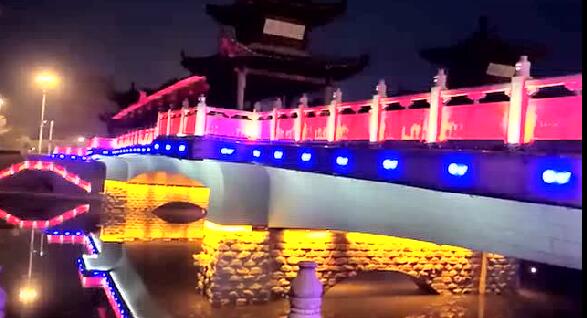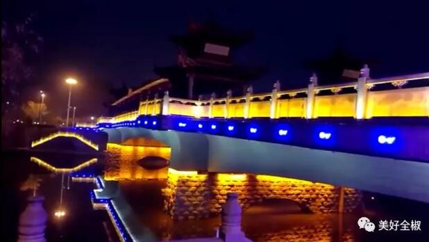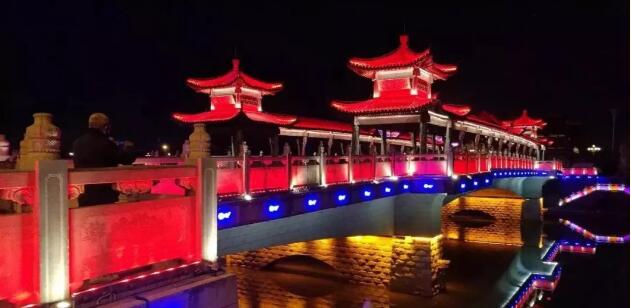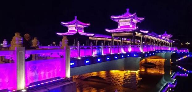 太平桥用隐藏式的瓦楞投光灯照亮建筑屋面,变幻四季颜色,绚丽多彩,形成一定的韵律感,河中倒影给人波光粼粼的胜境,整体气势恢弘,在桥的栏杆下一侧用定制的祥云图案灯顺序排列,寓意祥和、太平,突出太平盛世文化。