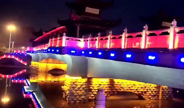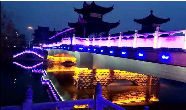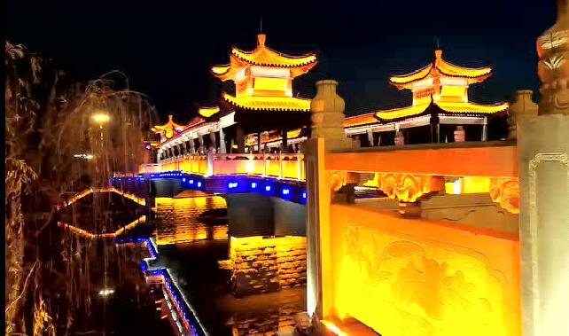 太平桥用隐藏式的瓦楞投光灯照亮建筑屋面,变幻四季颜色,绚丽多彩,形成一定的韵律感,河中倒影给人波光粼粼的胜境,整体气势恢弘,在桥的栏杆下一侧用定制的祥云图案灯顺序排列,寓意祥和、太平,突出太平盛世文化。